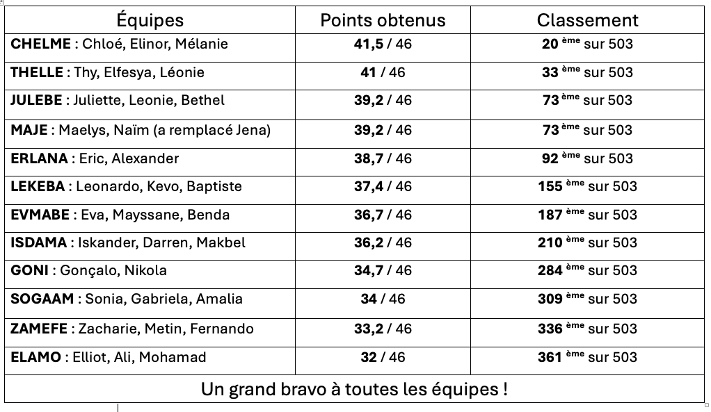 et le résumé du classement pour nos deux classes 6HA-6HB mélangées :